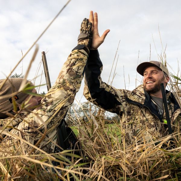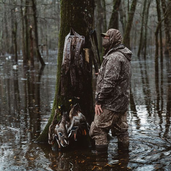 Patent pending, stowable 3 point, adjustable ‘turret’ hood with a flip up brim for increased visibility and contoured rain gutter design to directionally shed water off the back of the hood rather than the frontUnderarm casting stripes provide dogs with high- contrast directive visuals on long retrievesBottom Hem Wading Belt can be cinched low around the waist to keep jacket anchored when worn under waders OR cinched high around the chest for wading high water when the jacket is worn over wadersTwo-Way center front zipper for extra hem relief in seated or reclined positions. Supported by an internal storm flap and covered by a magnet secured external storm flapLow-Pro magnetic high hand pocketsWater-Resistant Zip-secure left chest cell phone pocketRight chest magnetic calls pocket with spit drain port and a 2-way self-seating storm flapDeep, shotshell dump pockets; easy access, magnet secured, waterproof “envelope” designDual kill switch D-rings support left or right-handed tiller steering on a duck boatKitLink ports for access to internal chest or handwarmer pocketing on your waders, complimented with triceps zips for full passthrough ventilation when dumping excess heatInternal mesh stuff pockets for spare beanies and glovesPatent pending, low pro comfort cuffs feature a wide, fold-over designs to create a more comfortable and secure seal around the wrist to lock heat in and water out