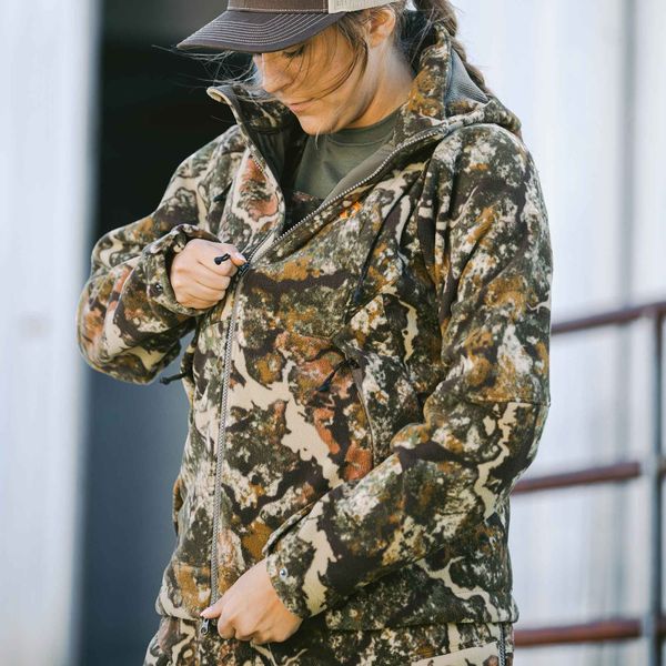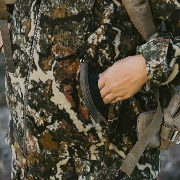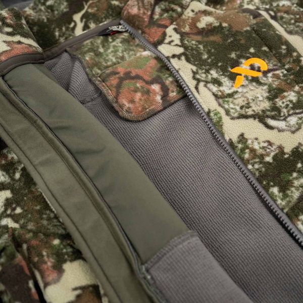 Windproof, water resistant, and durable fleeced softshellRemovable hood and contoured shooters collarMagnetic KitLink pass-throughAdjustable cuff for layering compatibilitySafety Harness Passthrough