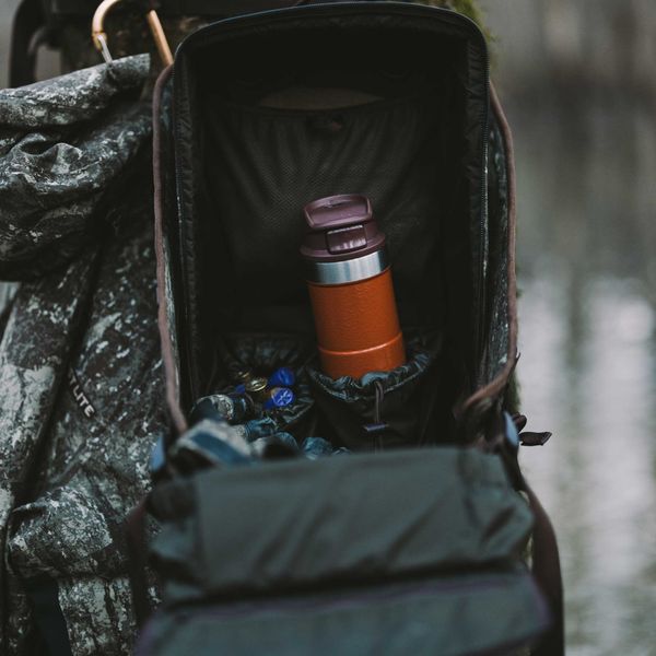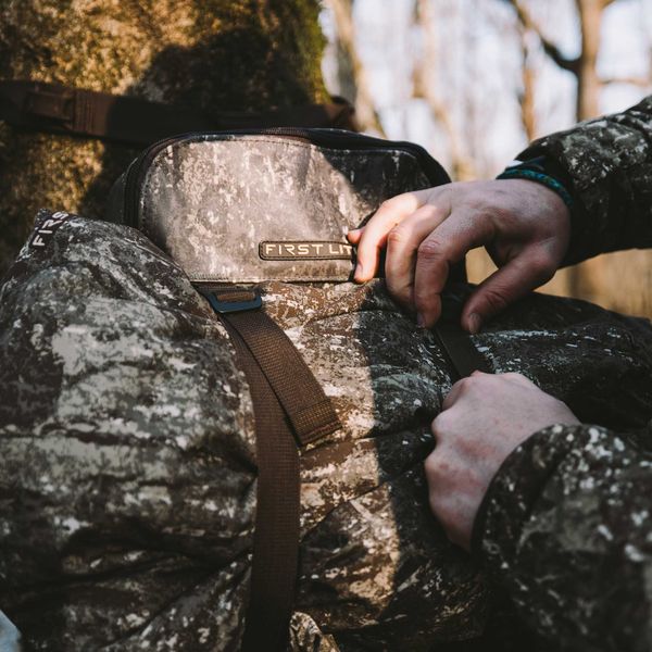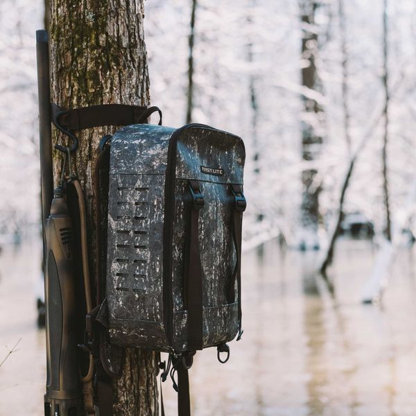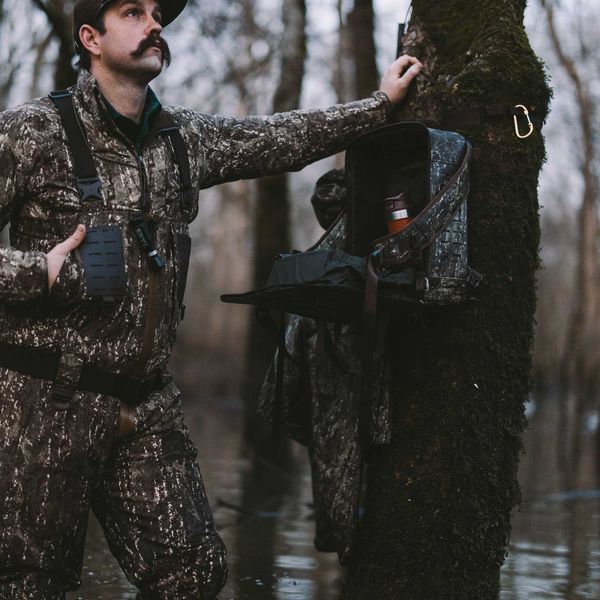 Waterproof TPU Coated 600D body fabric with matte finishFront panel opens completely to lay flat against the trunk of the tree for maximum concealment or attached to the shoulder straps for "coffee table" modeIntegrated tree strap stows into the back panelCarabiner gun hook accessoryOuterwear/gear case straps on the back panelDecoy carabiner D-rings for floating decoys to the holeStretch mesh stuff pouch and dual cinch top shell pouches2 reinforced MOLLE platforms for accessories like FHF's Bottle Holder, 6 Round Shotshell Holder, or Munitions Pouch