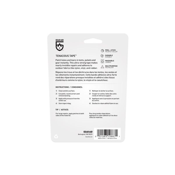 Peel and stick: No sewing skills or heat required; simply remove backing and applyDurable: Ultra-strong repair tape permanently bonds to outdoor fabrics and materials including nylon, vinyl, rubber and plasticWeather resistant: Fabric tape is sealed with a waterproof coating and won’t peel off during a wash or a stormNearly Invisible: Make repairs to rips and tears that are barely visibleMultipurpose: Sticks to almost any surface to repair camping gear, sleeping bags and pads, backpacks, and awnings