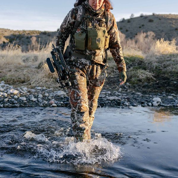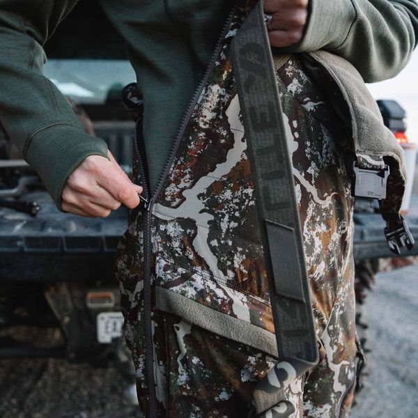 Durable, lightweight nylon body fabric with DWR Micro-fleece linerFull-length side zips for easy on/off at the truck or the base of your treeZip secure chest pocketKangaroo handwarmer pocketDual access cargo pockets optimized for seated or standing accessMagnetic top flap and side zip closuresInsulation: 60gsm legs / 80gsm body + 60gsm in the hand warmer chest panel